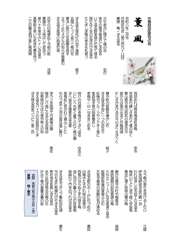 薫風 令和8年 2月号月例俳句会398号