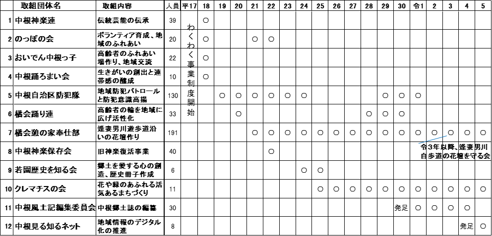中根自治区のわくわく事業取り組み団体(代表者が中根自治区の団体を含む) 制度開始以来、中根自治区でも多くの団体が取組んできています。